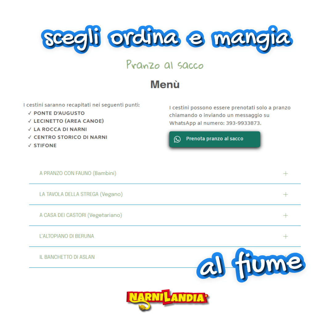 Per rendere la giornata ancora più speciale, puoi scegliere il servizio di Cestini di Narnia: pranzo al sacco già pronto, con ingredienti locali e freschissimi, consegnato direttamente lungo il percorso. Potrai gustarlo in riva al fiume, magari all’ombra di un salice, mentre l’acqua scorre lenta e trasparente.